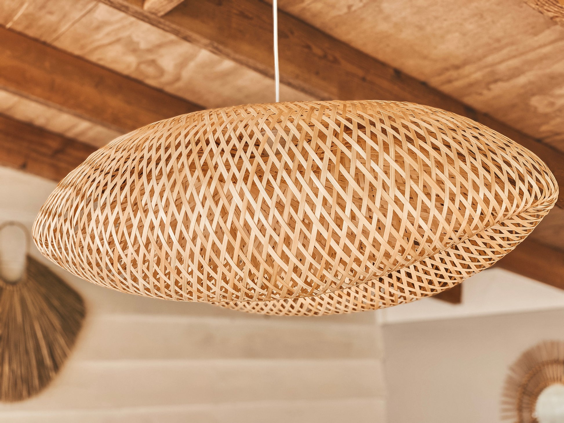 Deze lamp gemaakt van bamboe staat garant voor een heerlijke sfeer in welke kamer je hem ook hangt. Zoek je een Scandinavisch sfeertje of juist een Ibiza vibe, deze lamp past perfect! Door zijn natuurlijke kleur staat de lamp bij elk interieur, en de warme tint van bamboe maakt dat je kamer een rustige natuurlijke sfeer uitstraalt. De lamp is handgemaakt en verkrijgbaar in 2 verschillende maten. Deze lamp heeft een lengte van 80 cm, breedte van 60 cm en een hoogte van 20 cm.